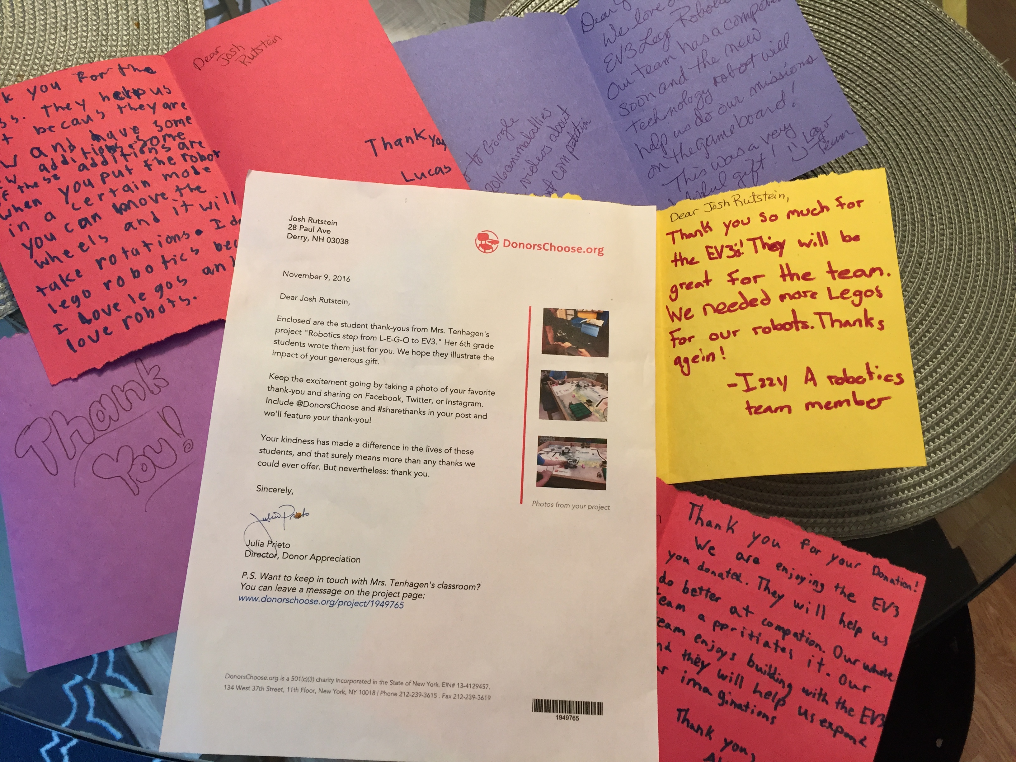 A few days ago I received a thank you letter from Donors Choose for a gift I gave to a class doing the Lego Challenge up at FIRST. I mentored a team a few years ago so I really like the program.